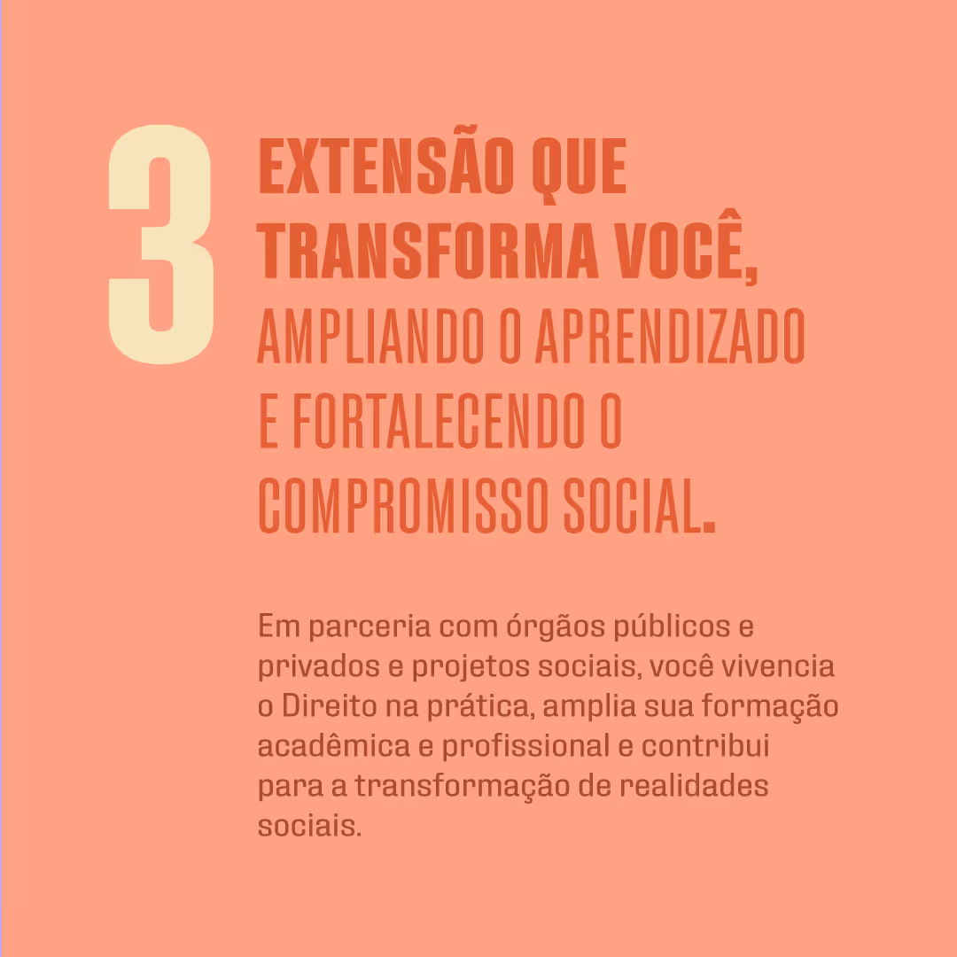 Em parceria com órgãos públicos e privados, com ampla participação em projetos sociais, você vivencia o Direito na prática, amplia sua formação acadêmica e profissional e contribui, de forma concreta, para a transformação de realidades sociais.