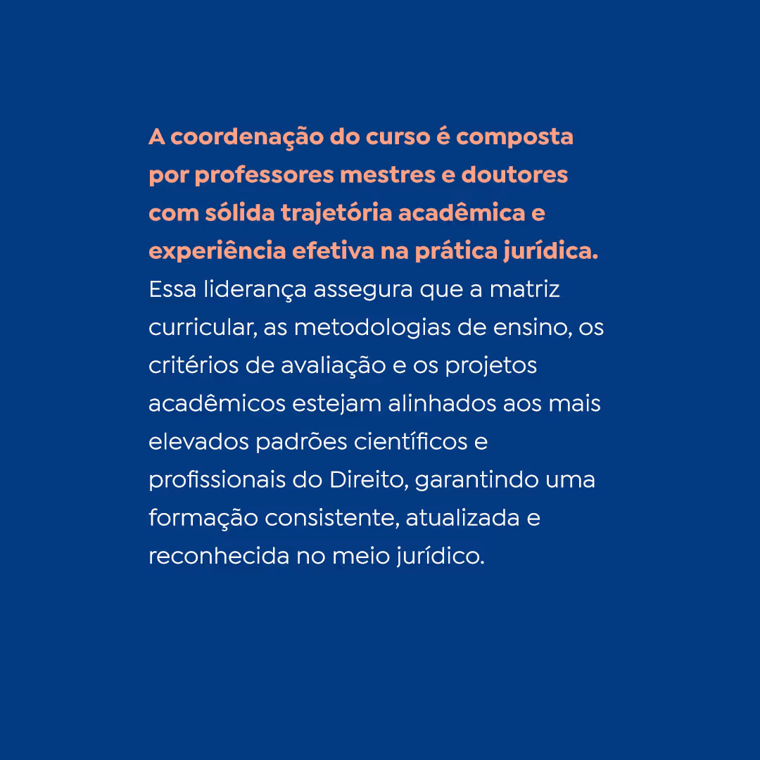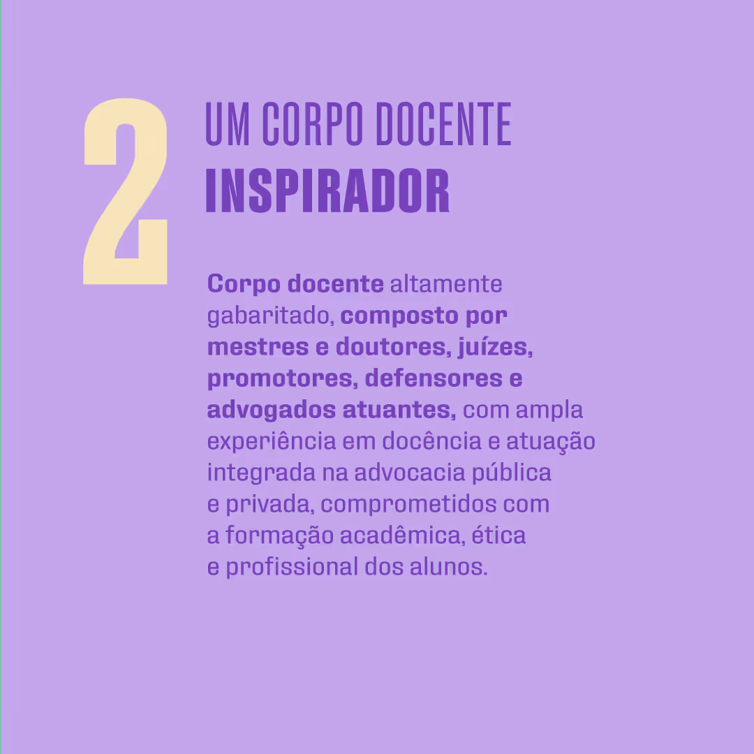Corpo docente altamente gabaritado, composto por mestres e doutores, juízes, promotores, defensores e advogados atuantes, com ampla experiência em docência e atuação integrada na advocacia pública e privada, comprometidos com a formação acadêmica, ética e profissional dos alunos.