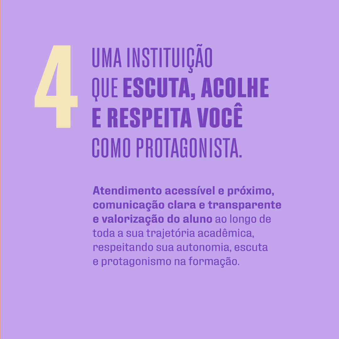 Atendimento acessível e próximo, comunicação clara e transparente e valorização do aluno ao longo de toda a sua trajetória acadêmica, respeitando sua autonomia, escuta e protagonismo na formação.