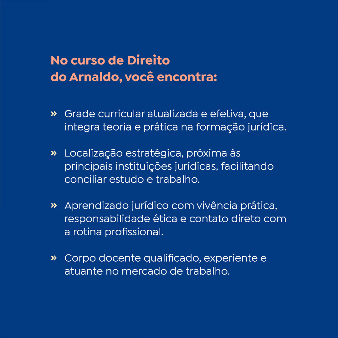 Se o seu projeto de futuro inclui estudar em um curso que atenda às novas demandas do mercado de trabalho de um mundo globalizado, você precisa conhecer o curso de Direito do UniArnaldo! No curso de Direito são utilizadas metodologias e ferramentas inovadoras que ampliam e democratizam o acesso ao conhecimento, como por exemplo, as bibliotecas digitais, metodologias ativas (aluno como personagem principal de sua formação), gamificações (jogos de conteúdo jurídico com objetivo de desenvolver a criatividade e autonomia do aluno para resolução de situações-problema assim como a promoção do diálogo), aplicativos, fóruns digitais de debates e sala de inovação. Em nosso curso, buscamos formar o profissional hands-on (mão na massa) valiosíssimo para o mercado de trabalho atual, e que se caracteriza por ter autonomia crítica, ser proativo e engajado na realização de suas atividades. Por isso, as atividades de prática jurídica, bastante diversificadas, começam bem cedo: no 5º período do curso! Além disso, escolhendo o curso de Direito do UniArnaldo, você estudará em um dos cursos que mais cresce, em qualidade, nos exames da OAB e do ENADE. E, claro, contamos com estrutura física belíssima e completa, com localização privilegiada, de acesso facilitado, seja por via de transporte público ou privado! Se ainda não conhece nossa estrutura, venha nos fazer uma visita! Será uma alegria receber você! O mundo está se transformando e você não pode ficar fora dessa! Vem ser Arnaldo!